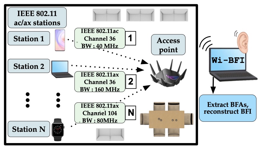 - Haque, K.F., Meneghello, F. and Restuccia, F., 2023, October. Wi-BFI: Extracting the IEEE 802.11 beamforming feedback information from commercial Wi-Fi devices. In Proceedings of the 17th ACM Workshop on Wireless Network Testbeds, Experimental evaluation & Characterization (pp. 104-111).