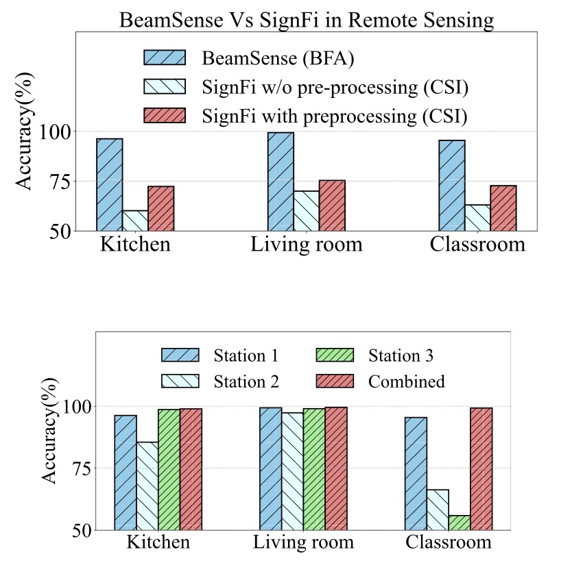 We demonstrated that sensing with BFAs achieves 10% higher accuracy than CSI approaches, and with our cross-domain adaptation (FAMReS), accuracy improves by up to 30% on unseen environments