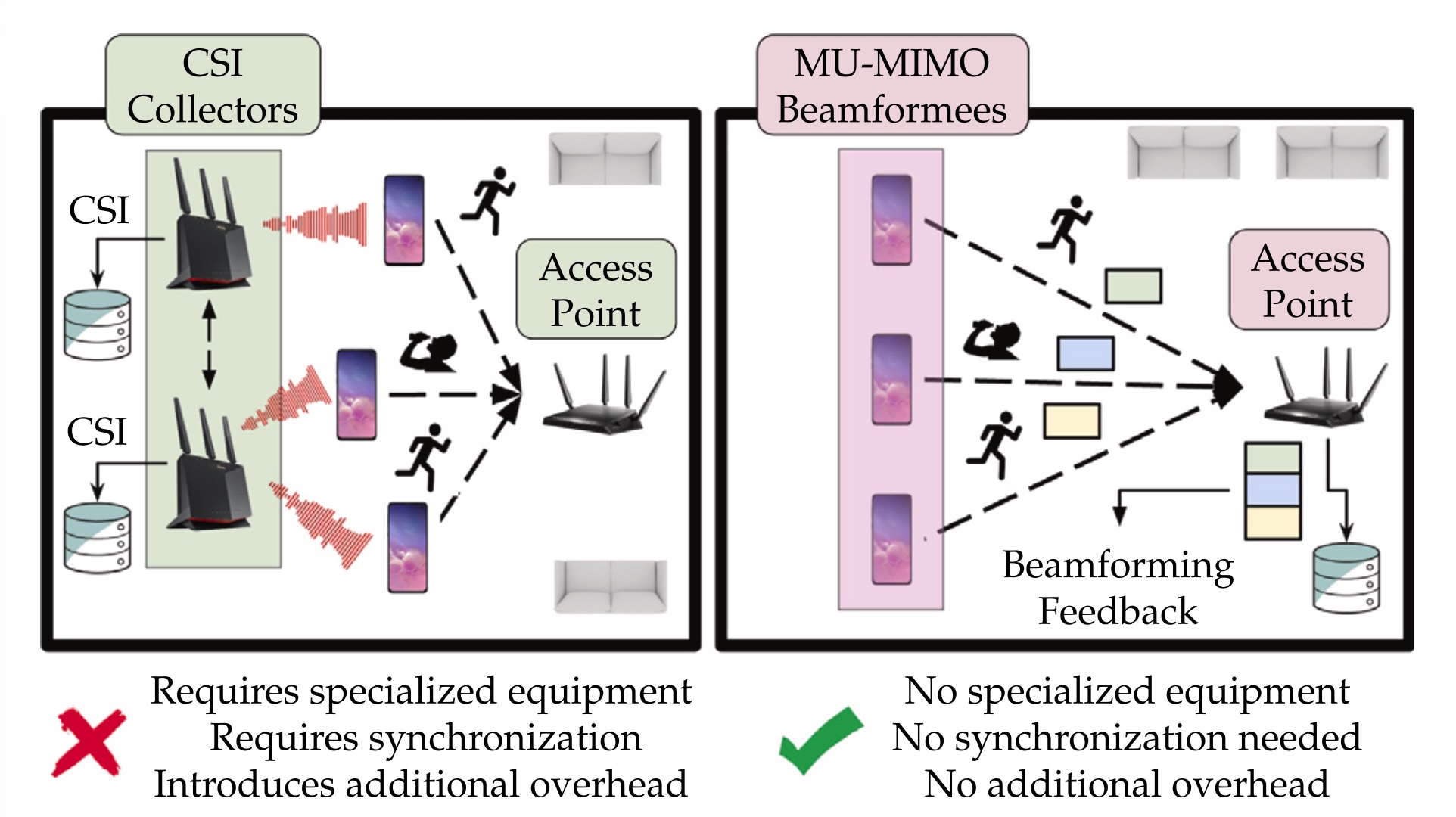 Unlike CSI-based approaches, which require specialized tools and only capture single-user links,